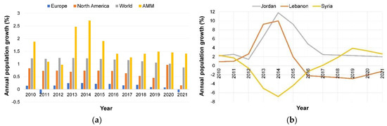 Population growth rate of the AMM countries: (a) comparison between the AMM countries, North America, Europe, and world; and (b) the impact of the Arab Spring in Syria on the population growth rate in Jordan and Lebanon (based on the data provided by [21,23]).