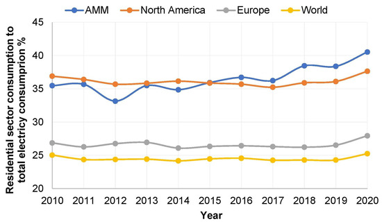 Comparison of the residential sector percentage consumption of the total electricity consumption in AMM countries, developed countries, and the world (based on the data provided by [28]).