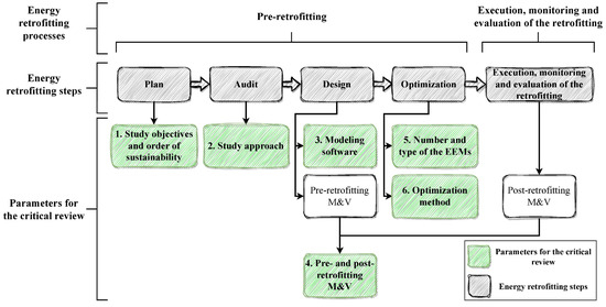 To thoroughly explore and investigate the objectives, outcomes, actions, and decision-making models related to the research on energy retrofitting in existing residential buildings, it is essential to comprehensively define and present all the parameters associated with energy retrofitting within existing studies. The energy retrofitting of existing buildings involves three main processes: pre-retrofitting, execution, and monitoring and evaluation, as outlined by Ma et al. [8]. Several steps within these processes are demonstrated to properly conduct energy retrofitting, as shown in Figure 4.