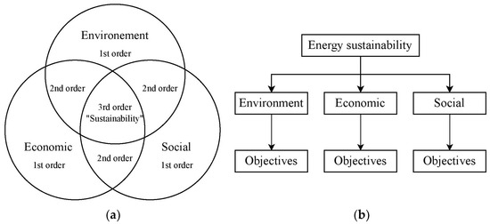 Energy sustainability criteria and objectives: (a) sustainability orders and (b) hierarchy of sustainability criteria and objectives.