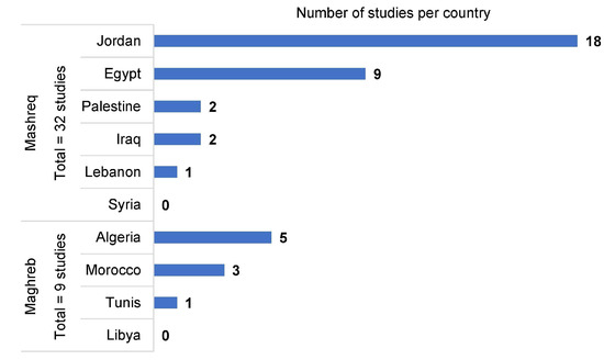 The initial search yielded 23,565 documents. Following the application of inclusion and exclusion criteria through Boolean options in SCOPUS and WoS, and the subsequent removal of duplicates, the search results were refined to 774 articles. The initial screening identified 328 articles, and after the second screening, 152 articles remained. The final screening process yielded 41 relevant studies in the AMM countries, with 32 studies found in Mashreq countries and 9 in Maghreb countries, as shown in Figure 7. In the Mashreq countries, there were 18 studies in Jordan [64,65,69,70,71,72,73,74,75,76,77,78,79,80,81,82,83,84], 9 in Egypt [85,86,87,88,89,90,91,92,93,94], 2 in Palestine [95,96], 2 in Iraq [97,98], 1 in Lebanon [99], and no study was presented for Syria. In the Maghreb countries, there were 5 studies in Algeria [100,101,102,103,104], 3 in Morocco [105,106,107], 1 in Tunisia [67], and no study was presented for Libya. Table 2 presents a record of all the studies found, including the year of publication, author names, and article titles, indicating the most prominent researchers in this topic within the region.