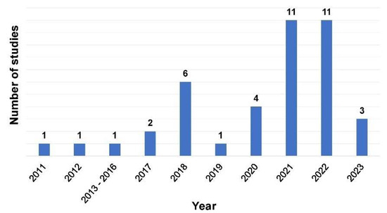 Furthermore, an analysis of the publication dates of the studies reveals that approximately 72% of the studies have been published in the past five years, while the remaining were published in the seven years prior to that, as shown in Figure 8. Notably, the years 2021 and 2022 witnessed the highest number of studies, with twelve published in each year. This pattern suggests that energy retrofitting is currently a prominent research area in the region, though the field is still emerging and maturing. This is attributed to the increasing importance of energy retrofitting in residential buildings, as explained in the earlier section.
