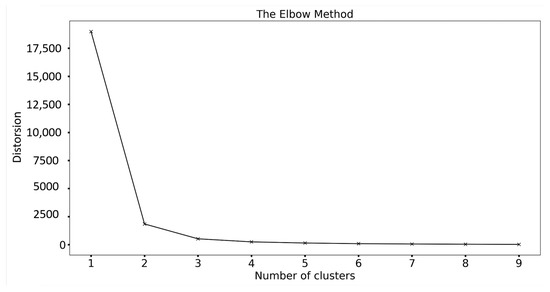 For this purpose, the 2-theta value of the centroids is taken and extended to a surrounding area from which the intensity data of the curves are taken. These data are later used as training features for the model. As initially mentioned, in the first step, pure substance measurements of siderite are obtained from XRD databases—in this case, from the freely accessible RRUFF database [15]. There are 34 measurements available for determining the highest peaks of pure siderite. The data consist of dimensionless intensities and their corresponding 2-theta values in degrees. In reality, slight deviations from the ideal crystal structure can occur due to, e.g., moisture content, higher pressure, lattice parameters, impurities, instrumental errors, or sample-displacement errors. Therefore, the siderite peaks are clustered due to these possible peak shifts. The resulting centroids serve as a center-point to define the areas of the peaks that are characteristic of siderite. The elbow method is commonly used for determining the necessary number of clusters [16,17]. The clustering method used for this is k-means. Two inflection points can be identified at positions 2 and 3 of the centroids (Figure 1), which are then usually assumed to be a suitable number of clusters.