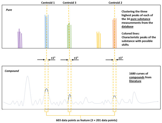 The following section describes the data preparation process. It can be divided into three main steps. The first step is to extract the three highest peaks of pure substance measurements of the searched substance from databases. In the next step, the peaks are clustered to obtain characteristic starting values, which should indicate the position of the substance in the compound measurements. The final third step is the feature extraction from an experimental dataset of compounds, which can be found in the literature.