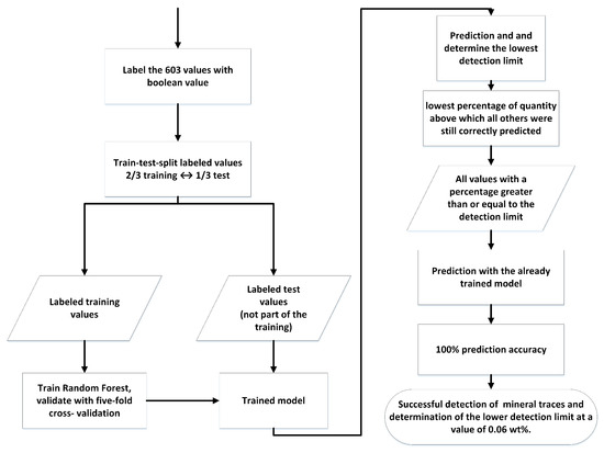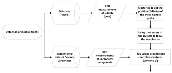 This section aims to delineate the methodological approach for detecting traces of minerals within a mixture. For this approach, pure substance measurements are selected from databases, and their highest peaks are determined, from which search ranges are derived. Subsequently, these search ranges are utilized to delimit the regions containing the requisite information for prediction in mixture measurements and for model training. Following this, the results are verified, and the detection limit is established using this model. This procedure is structured into three segments: data preparation, implementing the machine learning model, and validating the outcomes.