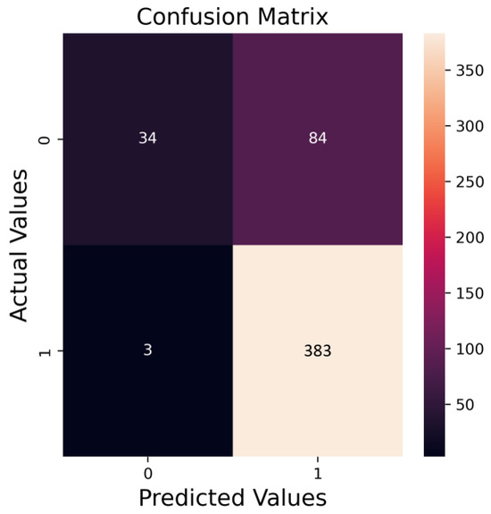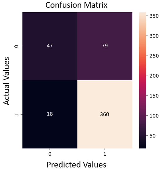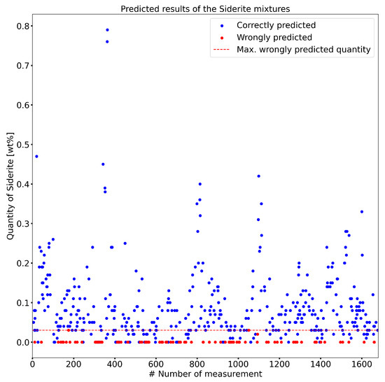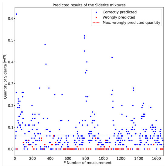 This can be further detailed in a confusion matrix. The confusion matrix reveals that out of a total of 504 measurements, 439 were classified in the class containing siderite, and 55 were classified in the class without siderite. Among these, 407 values were correctly predicted. These correct predictions can be further categorized into 360 true positives and 47 true negatives (Figure 5). Upon examining the scatter plot (Figure 6), it becomes evident that the incorrectly predicted mixtures are situated below a threshold of siderite content in the mixture. Upon closer examination of these data points, it is evident that no mixture with a siderite content above 0.06 wt% was incorrectly predicted.