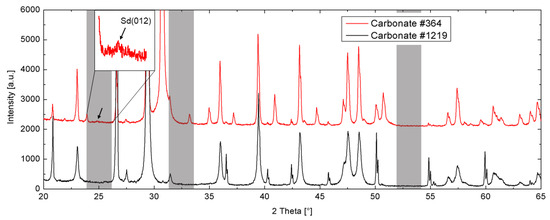 As already described, a second scenario was carried out with the siderite database data, which only takes into account measurements that were carried out under normal conditions. There were only three datasets remaining, but this should not have posed any problems, as there was now minimal deviation expected between the datasets. The centroids were therefore at 24.80°, 32.07°, and 52.94°. Consequently, the ranges ±1° around the centroids were determined at [23.80°, 25.80°], [31.07°, 33.07°], and [51.94°, 53.94°]. The data were extracted from the dataset in the same way as described before. For a better overview of the procedure, the intervals are shown as examples in two measurements (Figure 7). These include one measurement with 0.79 wt% (#364) and another with 0.06 wt% (#1219), which corresponds to the highest mass fraction of siderite in all compounds and the limit reached in this approach. In addition, the highest siderite peak (012) in the measurement #364 is shown enlarged. This represents the most recognizable siderite peak in all XRD patterns because of the highest siderite wt% of all compounds.