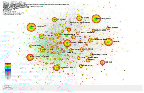 In CiteSpace, “Cited journal” was selected as the node type to map the most cited journals in the field of green buildings. As shown in Figure 2, 975 nodes with 6151 rows and a density of 0.0134 were obtained. The color bar legend on the lower left corner represents the chronological order, with redder colors corresponding to closer years. The top five most cited journals are “Energy and Buildings”, “Renewable and Sustainable Energy Reviews”, “Journal of Cleaner Production”, “Sustainability-Basel” and “Sustainable Cities and Society” (as shown in Table 1). Among them, “Energy Buildings” has been cited the most, totaling 1043 times, and thus has great influence and impact in the field of green buildings.