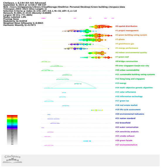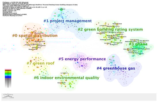 As can be seen from the time-based view of the network in Figure 5, although “project management” (1#) is the second largest cluster among all, most of the related publications occurred before 2015. Project management in green buildings involves the planning, coordination, and execution of construction projects with a strong focus on sustainability and environmental responsibility [31,32]. It plays an essential role in meeting the sustainability goals of reducing environmental impact, improving energy efficiency, conserving resources, and creating a healthy indoor environment for occupants throughout the entire life-cycle of green buildings [33,34].
