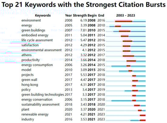 To better discern research hotspots in the field of green buildings, co-citation network and keywords citation bursts were generated using CiteSpace and the results are shown in Figure 4 (cluster view of network) and Figure 5 (time-based view of network) and Figure 6 (keyworks citation bursts), respectively. As can be seen from Figure 4, the network consisted of 894 nodes and 3535 lines, clustered in eight main categories: spatial distribution (0#), project management (1#), green buildings rating system (2#), Ghana (3#), greenhouse gas (4#), energy performance (5#), indoor environmental quality (6#), and green roof (7#). From the time-based view in Figure 5, we can also see other older or smaller clusters like bridge construction (#8), environmental indicators (#20), etc.; among them, life-cycle assessment (#19), green façade (#26), and multi-objective genetic algorithm (#14) clusters are relatively new and interesting. From the keywords citation bursts in Figure 6, we can observe that keywords related to energy including “embodied energy”, “energy consumption”, “energy conservation”, etc. are long-term concerns in the field of green buildings. In particular, “renewable energy” has received a lot of attention in the past two years. In addition, “life cycle assessment”, “model”, “plant” related to “green wall”, etc. are also worth paying attention to. Based on the above, research hotspots in the field of green buildings will be discussed from the following aspects.