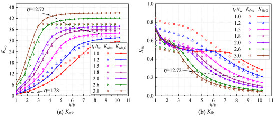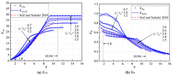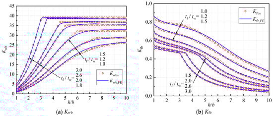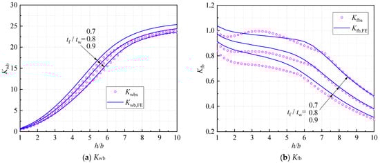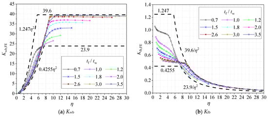 Gardner et al. [10] found that the relationship was always satisfied for I-sections subjected to pure bending, where stands for the minimal buckling stress of the cross-section and the other variables represent the minimal buckling stresses of the isolated plates under simply supported (with the superscript “SS”) and fixed boundary conditions (with the superscript “F”). The subscripts “f” and “w” represent the flange and web, respectively. The above-mentioned relationship could be converted into and by considering the buckling stresses of the isolated plates. Consequently, the upper and lower bounds of Kwb and Kfb could be obtained, as illustrated in Figure 2a,b with the black dashed lines.