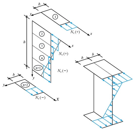 For the elastic local buckling of I-sections under axial compression, a theoretical solution has been presented, and buckling stresses can be obtained by solving a differential equation and considering the boundary conditions [15]. Very good agreement has been found between the analytical and FE results. However, this theoretical solution is not applicable to loading conditions other than axial compression. An analytical approach was also presented in the study by Ragheb [22] on the elastic local buckling of pultruded FRP sections under eccentric compression. In his approach, the web, with the stress gradient, was divided into strips under axial compression (Figure 3). A differential equation could be created for each strip, and they were treated as thin plates under the axial compression. By applying the continuity conditions between adjacent strips and the boundary conditions, the characteristic transcendental equation in matrix form could be obtained. By assuming the buckling displacements, the buckling stresses could be solved via a numerical program.