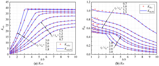 The analytical approach presented by Ragheb [22] was modified in this study to solve the buckling stress of the I-section beams under pure bending. In doing so, each of the flanges was divided to two strips of the same dimensions, while n = 10 was adopted for the web division. Following the method established by Ragheb [22], a matrix (4n + 8 and 4n + 8) for the characteristic transcendental equation was obtained. A Matlab code was then developed for solving the characteristic transcendental equation, with which the buckling coefficients, Kwb,t and Kwf,t, could be calculated (Figure 4). As shown in Figure 4a,b, the buckling coefficients from the FE analyses and analytical approach matched very well, indicating that both methods were reliable.