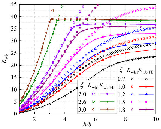 As is shown in Figure 6, the buckling coefficients derived from the energy method () were in good agreement with the FE results () for and relatively small h/b values. However, the comparisons in Figure 6 show that was always greater than for greater h/b values, and it may have exceeded the upper limit of . Therefore, based on the FE results, the maximum values for could be derived from Equation (17). The predictions from Equation (17) () were compared with those from the FE analyses (), and as shown in Figure 7, they matched well.