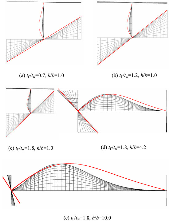 Besides the maximum values, significant differences between and could be seen in many cases, as shown in Figure 6, especially for the I-sections with small values for (i.e., ). This was mainly due to the discrepancies between the assumed and actual buckling modes (see Figure 8), which may have resulted in the overestimation in the buckling load in employing the energy method. We compared the buckling modes with the FE results, and as seen in Figure 8, the assumed buckling modes in Equations (7) and (9) are shown using red solid lines.