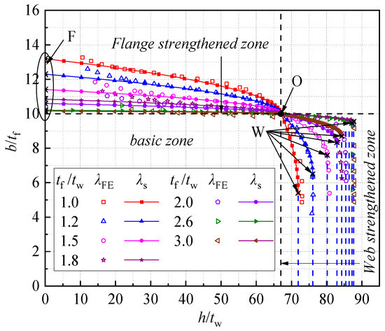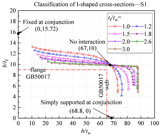 The interactions between the width-to-thickness ratios of the compressive flange and the web are shown in Figure 13 for the S1 sections (). It should be noted that the value of k adopted in Figure 13 was from the FE analyses, and the yield stress was taken as 235 N/mm2. As shown in Figure 13, the width-to-thickness limits of the compressive flange and the web were no longer constant as long as the flange–web interaction was taken into consideration in the analyses. As shown in Figure 13, all curves of the interaction intersected at a unique point (67, 10), at which point no interaction between the compressive flange and the web existed at the local buckling. For the width-to-thickness ratio of the web (, a value smaller than 67), the width-to-thickness limits of were greater than 10 due to the rotational restraints of the web. This restraining effect decreased with the increase in the ratio, leading to the reduction in the width-to-thickness limit of . The compressive flanges turned to provide rotational restraints to the webs when the width-to-thickness ratio of the web, , became greater than 67, which resulted in the width-to-thickness ratio of the compressive flange, , being smaller than 10. Further, for all the curves shown in Figure 13, the limits tended toward 15.72 (corresponding to k = 1.247), with the limits approaching zero. It is worth mentioning that k = 1.247 was the upper bound of the buckling coefficient of the compressive flange (i.e., the fixed condition at the flange–web conjunction).