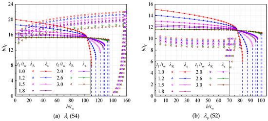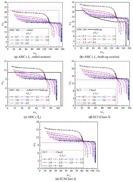 More comparisons between these two solutions were made, as shown in Figure 17a,b. In order to obtain the relationship between b/tf and h/tw, Equations (28)–(31) were rewritten as follows: for the compressive flange buckling of compact sections,