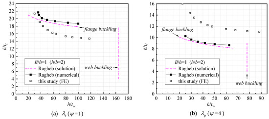 where the flange width B = 2b and the limits and correspond to the rotation index of 4 and 1, respectively. is defined as the rotation of the beam at the local buckling over the rotation of the beam at yield. As shown in Figure 16a,b, the predictions of Equations (28)–(31) were compared with those from the solutions of the present study (Equations (25)–(27)) for I-sections with h/b values equal to 2.0. The values of the elastic modulus E and the yield stress fy adopted herein were 200,000 N/mm2 and 250 N/mm2, respectively. It can be seen from Figure 16a,b that the width-to-thickness limits proposed by Ragheb [13] were greater than those obtained using the solutions in this study for non-compact sections (equivalent to class 3 or S4), but they were conservative for compact sections (equivalent to class 2 or S2). As shown in Figure 16a,b, the width-to-thickness limits of the compressive flange decreased with increases in the h/tw ratio, which was the case for the predictions of both solutions. It should be noted that the variations in b/tf and h/tw, as shown in Figure 16a,b, were achieved by varying the values of tf/tw, as the aspect ratio h/b was fixed at 2.0.