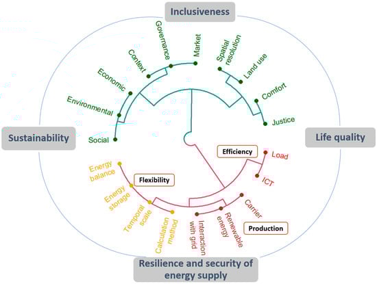 In summary, by examining the diverse definitions in the existing literature, a common set of PED elements can be drawn up. These elements, rather than offering a narrative description, work to condense definitions by providing a collection of concrete factors that are vital to the success of PEDs and can be individually treated as a means of characterizing PEDs. Nineteen elements have been identified. Each one is either a specification or an enabler of one of the four principles. For example, comfort is an important metric for evaluating life quality and smooth interaction with the grid when the production of renewable energy can ensure the resilience and security of the energy supply. The elements are grouped into two clusters in Figure 1, with the bottom semicircle being the three functions of the urban energy system and the top semicircle being non-energy issues. Each of the functions forms a sub-cluster, where energy efficiency is on a higher level due to its priority to be considered among the three functions. A similar clustering process has been applied to the non-energy issues. In the upper left quarter, for example, the three pillars of sustainability have been clustered together, alongside a cluster of principle- and policy-related elements. The elements in the top right quarter reflect specific aspects of the local implementation process.