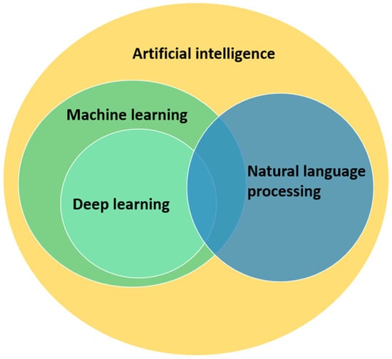 Artificial intelligence (AI) means designing and applying algorithms in a computational environment to simulate human intelligence and solve complex problems, such as computer vision, control, entity recognition, and classification. As the application of AI in many domains has assisted people and often worked to improve productivity, the integration of AI techniques into building energy management mainly concerns thermal comfort [] and energy use [] prediction, building system control [], fault detection [], and building information modeling []. The evidence from these applications, therefore, provides abundant hands-on experience for PED learning and replication. Among the various AI techniques, the versatility and scalability of machine learning (ML) and natural language processing (NLP) make them highly suitable for large datasets and complex problems. These two techniques are also constantly evolving, with new models and algorithms being developed to improve their performance all the time. Through constructing problem-oriented algorithms, ML learns to automate analytical models from data rather than being taught how to improve its learning abilities. Deep learning, as a subset of ML, is based on multi-layer artificial neural networks that can efficiently model the complex relationships between neurons and recognize complex patterns in the input data. As a sub-field of AI, NLP integrates linguistics and computer science to enable a computer to process and understand natural language data. The most common data source for helping a computer to develop rules for decoding information comes in the form of audio and text. Typical NLP tasks comprise named entity recognition, part-of-speech tagging, topic modeling, machine translation, and text classification. Sometimes, as indicated in Figure 2, NLP tasks need to be executed by using ML or a deep learning method. In these cases, there can be overlaps between solving an NLP task and ML algorithms. Training ML and NLP models requires feeding them with large amounts of labeled or unlabeled data and utilizing an algorithm to optimize and iteratively refine the parameters to improve their performance. The flow of actions necessary for this training to take place—from data collection to final model—are compared in Figure 3 and explained in the following sections.