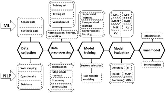 - Data collection—ML requires input data that is mostly collected by sensors or generated synthetically []. The Internet of Things (IoT) has a significant potential to enhance the efficiency, effectiveness, and scalability of sensor techniques, while computer simulations and statistical methods are often used for generating synthetic data.