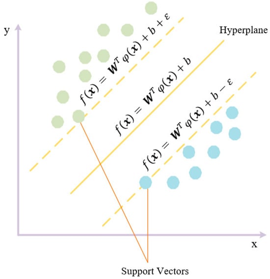Support vector machines (SVMs) solve classification or regression tasks by transforming data into a high-dimensional space that can be easily separated by a hyperplane []. SVMs are designed to maximize the distance between the decision boundary and the nearest data points of each class. This distance is known as the margin, and it plays a crucial role in defining the region of the feature space where the SVM is expected to have good generalization performance.