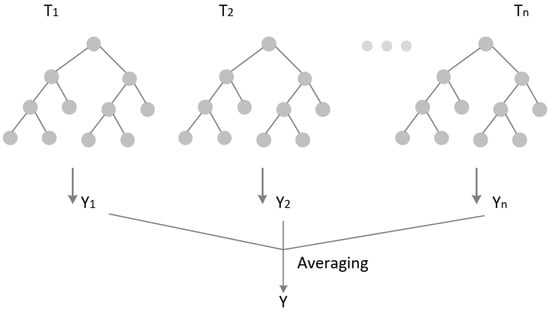 Partitioning data into smaller subsets, in a structure similar to the roots of a tree, is another mechanism for solving classification and regression problems. Each non-leaf node corresponds to a single feature, each branch corresponds to a different value for a feature, and each leaf node represents a class of predictions. Random Forest (RF) is one of the most commonly used tree-based approaches. In RF, predictions are made by combining an ensemble of trees in a forest []. Given the diversity in any dataset, the combined approach of trees in a forest will lead to more reliable results than a single-tree approach. Figure 6 shows the diagrammatic structure of RF. RF has been used for both classification and regression problems, including modeling solar irradiation, age of building and energy consumption, and forecasting electricity load [].