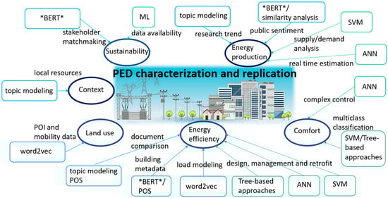 The cases where NLP approaches have been applied to PED elements have focused on energy efficiency, energy production, sustainability issues, context, markets, and land use. The techniques used most frequently are word2vec, topic modeling, and BERT and its variations, followed by a number of computationally less intensive techniques, such as POS, text similarity/co-occurrence, and TF-IDF. As can be seen from Table 2, some studies combined multiple techniques to address a specific element [,,,,,,,,], while some less frequently used or known techniques were discovered in building ICT, building load, and renewable energy.