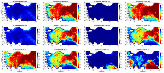 The following climate impact factors were obtained for each individual day during the year for the historical and future periods of analysis considering all the grids over Türkiye.