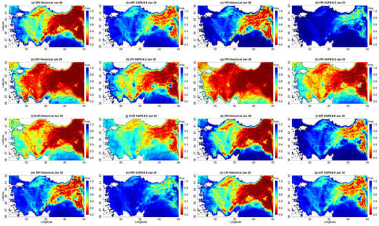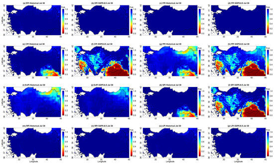 Considering the Pavement activity, Figure 3g,h and Figure 4g,h, the results exhibit increasing activity performance in the future, except in the Eastern and Southeastern Anatolia regions of Türkiye for January 30th. In Western and Central Anatolia, the pavement activity performance almost doubles compared to the historical performance values. However, the performance index for July 30th decreases in most of the regions.