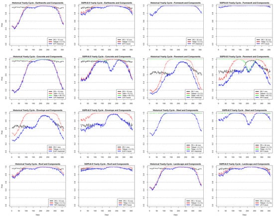 As in the Concrete activity, it is seen that the minimum temperature and precipitation parameters are more impactful on the performance of Pavement activity due to the low probability of the temperature exceeding 40 degrees for the selected coordinate (Figure 5). The parameter that is particularly effective in spring and summer is the precipitation component. When the historical period and the 2071–2100 period under the SSP5-8.5 scenario for the same activity are compared, it can be said that Pavement performance at the selected point will experience significant increases in the spring and winter months because of increasing temperatures. Increasing temperatures also cause a slight decrease in performance in summer months.