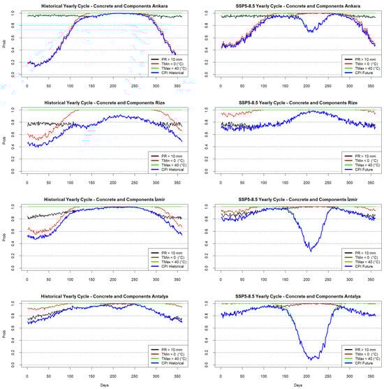 In Figure 5, the annual variation in the Concrete activity index and the components that form it for the Ankara coordinates during the historical and future periods are given. Due to the almost negligible probability of the temperature being above 40 degrees and daily precipitation greater than 10 mm in the selected coordinates, it is seen that the minimum temperature parameter is the dominant component for the activity performance. When timeseries are examined, it can be said that Concrete works’ performance at the selected location will experience significant increases during the winter months. Especially in the first months of the year, differences up to 30% indicate that temporal negative effects will decrease in reinforced concrete construction and concrete casting works. However, as a reverse effect of this positive impact in winter, a decrease in workability can be seen in a certain period during the summer; nevertheless, it has a lower impact compared to the aforementioned increase in the winter months.