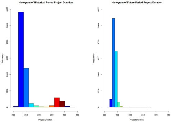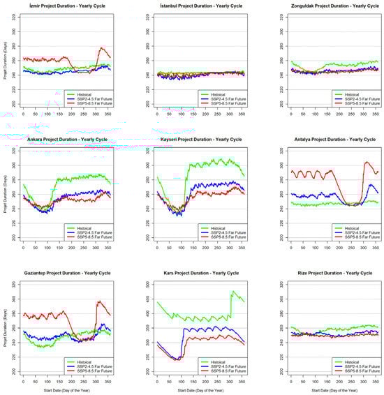 Figure 7 shows the project duration change according to the selected start date for nine locations with different climatic conditions for the historical and far-future periods with two scenarios. This provides a particular evaluation of the project start date to maintain the project schedule and avoid unexpected delays. Furthermore, the figure also implies that a project can have very different schedules because of the selected location. In Figure 7, although the same project is investigated, nine different locations exhibit remarkably different historical and future schedules when activity performances are applied to the default project schedule (the schedule where activity durations were determined without considering the potential effect of climate).