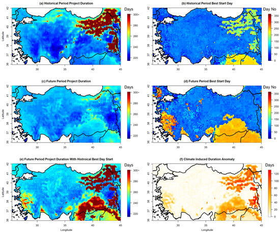 In order to accurately interpret the increase (or decrease) mentioned above, the spatial distribution and frequency of these increases (or decreases) must be considered. Spatial plots of the selected periods also show the minimum and maximum durations of the aforementioned project over the entirety of Türkiye for the historical period and future period (Figure 8).