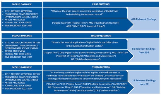 The paper questions the issues related to the level of transfer of DT approaches to the construction sector, their application in the operation and maintenance phase (O&M), and the type of contribution that their use can make in terms of the activation of decarbonization processes in the sector. This paper views future challenges via a critical literature review, as introduced in Paragraph 3, specifically concerning the following three questions performed in the Scopus database.