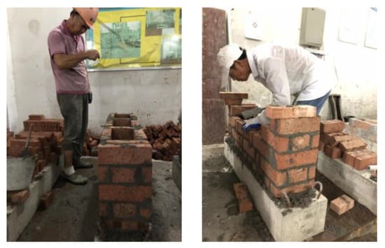 The unreinforced wall masonry follows the guidelines of GB 50924-2014 code for the Construction of Masonry Structures Engineering. Testing utilizes clay sintered bricks, particularly Daren bricks, which are unique to Wenzhou, and the more commonly used strength grades of masonry mortar are categorized as M 2.5, M 5.0, M 7.5, and M 10.0 []. For each mortar strength, two identical walls are constructed, totaling eight empty bucket walls.