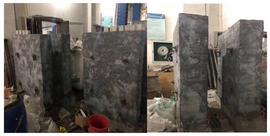 The reinforced wall masonry adheres to the specifications outlined in GB 50924-2014 Code for the Construction of Masonry Structures Engineering. Testing involves the use of masonry mortar with strength grades of M 2.5, M 5.0, M 7.5, and M 10.0 for the test []. Corresponding to each masonry mortar, two identical walls are constructed, totaling eight empty barrel walls. These walls are divided into two groups: the first group is numbered G 2.5–1, G 5.0–1, G 7.5–1, and G 10.0–1; and the second group is numbered G 2.5–2, G 5.0–2, G 7.5–2, and G 10.0–2. The empty bucket walls in both groups share the same aspect ratio, dimensions, and masonry as the unreinforced walls. Following the completion of masonry, the walls are kept in the natural environment for 28 days. After this period, the walls are reinforced by applying layers of mortar reinforcing bars to the four walls and the top face of the empty bucket walls, with an average thickness of 8 mm. After reinforcement, the walls undergo maintenance in a natural environment for an additional 32 days. Subsequently, the G 2.5–1, G 5.0–1, G 7.5–1, and G 10.0–1 walls are placed in a dry environment, while the G 2.5–2, G 5.0–2, G 7.5–2, and G 10.0–2 walls are maintained in a natural environment. Due to the reinforced wall’s coated surface preventing wetting during wet conservation, the interior of the wall is wetted and conserved. The protected reinforced wall is depicted in Figure 6.