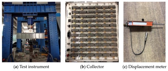 The damage load detection of an unreinforced empty bucket wall is performed with a 1000 kN compressive loading system; the compressive testing machine is shown in Figure 7, and the collector is a static collector produced by Jiangsu Donghua Company. The collector adopts a DH3816N static stress test and analysis system; the supply voltage is 220 V/50 Hz, and the sampling frequency is 2 Hz. The displacement meter adopts an SDP-100CT type displacement meter produced by Japan Tokyo Sokki Kenkyujo company; the range is 100 mm. The compressive testing machine, static collector, and displacement meter are shown in Figure 7.