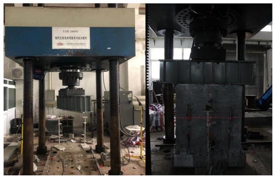 The reinforced empty bucket wall compressive test was carried out on a 10,000 kN microcomputer-controlled electro-hydraulic servo multifunctional testing machine, which was designed and produced by Hangzhou Bonneville, as shown in Figure 8. The acquisition instrument and displacement meter are the same as the equipment used for unreinforced walls.
