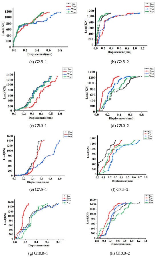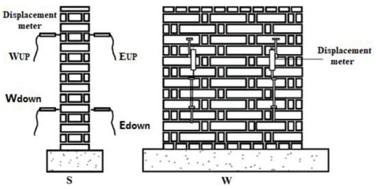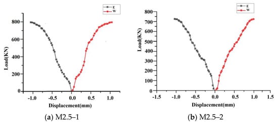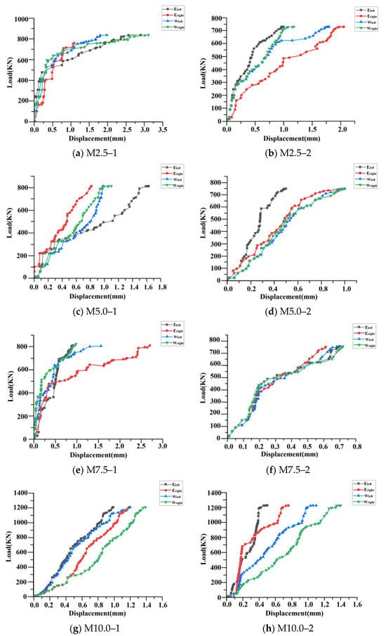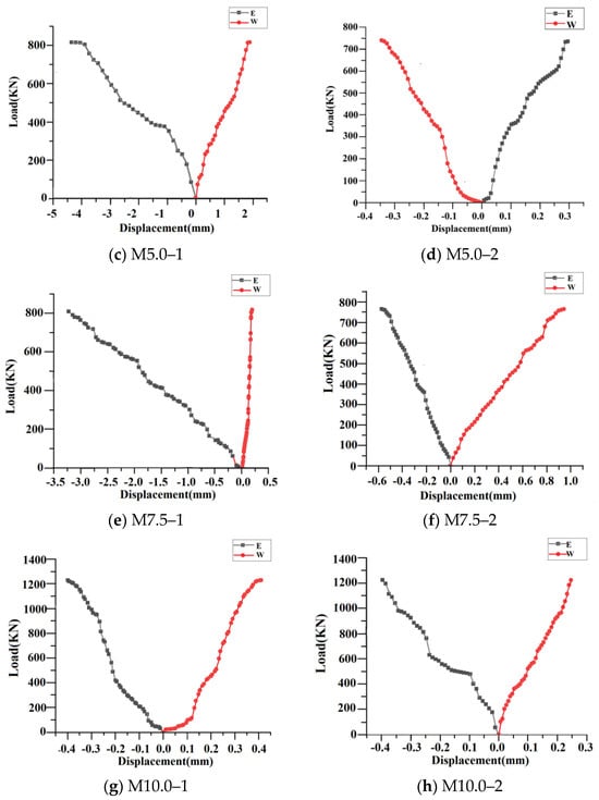 Figure 11 illustrates that the horizontal displacement of the walls of the same strength is generally larger in the dry environment than in the wet environment after a certain time of maintenance under the action of the vertical load. Among them, except for wall M 5.0–2, which produced outward deformation (bulging outward) on the E side and inward deformation (depression inward) on the W side, the rest of the walls produced outward deformation (bulging outward) on the W side and inward deformation (depression inward) on the E side. When the load reaches the cracking state of the wall, its horizontal displacement increases significantly.