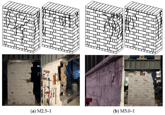 Before loading the wall, the wall was first leveled with plaster at the top of the wall, and after leveling, the pre-pressure was started, after which the instrument readings were checked, and then the formal loading test was started. During formal loading, the loading rod was slowly shaken while ensuring that the rate was as uniform as possible at each loading until the specimen was damaged and the loading was stopped []. The distribution of cracks in each section of the unreinforced empty bucket wall is shown in Figure 10.