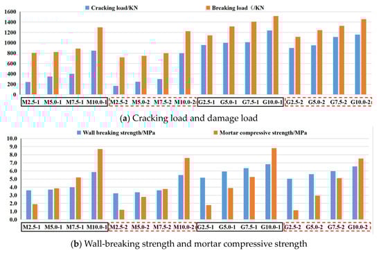 - From the maintenance of unreinforced vacant bucket walls of the same strength in different environments in Figure 16, it can be seen that the cracking and damage loads of unreinforced vacant bucket walls in wet environments are significantly lower than their cracking and damage loads in dry environments, where for cracking loads, M 2.5–2 is 30% lower than M 2.5–1; M 5.0–2 is 28.5% lower than M 5.0–1; M 7.5–2 reduced by 25% compared to M 7.5–1, and M 10.0–2 reduced by 5.8% compared to M 10.0–1. For damage load, M 2.5–2 reduced by 10.8% compared to M 2.5–1; M 5.0–2 reduced by 9% compared to M 5.0–1; M 7.5–2 reduced by 8.4% compared to M 7.5–1, and M 10.0–2 reduced by 5.6%, indicating that the cracking load decreases more significantly for walls maintained in a humid environment, which are more affected by the wet and dry environment than those affected by the damage load. In addition, the cracking load and damage load of the empty bucket wall under the same maintenance environment both become larger with the increase in masonry mortar strength, indicating that the strength of masonry mortar has a significant effect on the overall bearing capacity of the empty bucket wall, in which the cracking load and damage load of the empty bucket wall with M 10.0 strength of this test are significantly higher than those of the other three strengths, indicating that the masonry mortar with mortar strength grade M 10 and Dalun brick combination can significantly improve the bearing capacity of the wall so that the overall bearing capacity of the wall can be significantly improved;