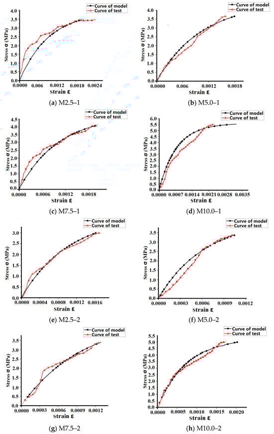 The average compressive strength and elastic characteristic values of the brick wall were substituted into Equation (2) to calculate the fitted model stress–strain curve, and the test stress–strain curve was compared with the model stress–strain curve, and the results are shown in Figure 17.