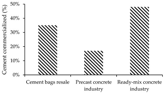 The objective of this paper is to analyse the potential incorporation of the carbonation curing strategy in the Portuguese concrete industry. Restricting the study to this strategy means restricting the analysis to the precast industry. Figure 1 presents the distribution of cement commercialized in Portugal, divided into the resale of cement bags (essentially used in mortars), the precast concrete industry and the ready-mix concrete industry [40,41]. Even though precast concrete corresponds to only 17% of the totality of the cement market in Portugal, when only the concrete manufacturing industry is considered, the precast industry occupies more than a quarter of the cement market. This consideration is especially important, since the manufacturing industry, by utilizing cement to produce a diverse set of cementitious products, divulges different opportunities for the introduction of CCUS technologies [40,41].