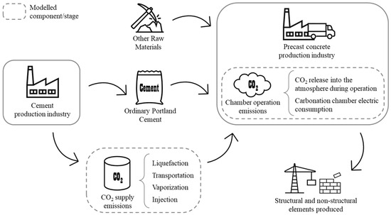 The balance between CO2 emissions and storage for concrete was assessed by simulating the performance of the stages identified in Figure 2. A mixed approach was adopted to obtain the data required to run the simulation, including (i) official sources (CO2 emissions from electricity generation and land transportation); (ii) research results from the literature (CO2 absorption and energy consumption during carbon curing); and (iii) questionnaire replies (precast concrete consumption and composition).
