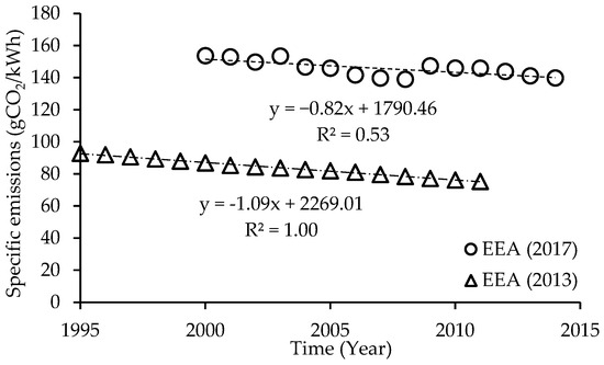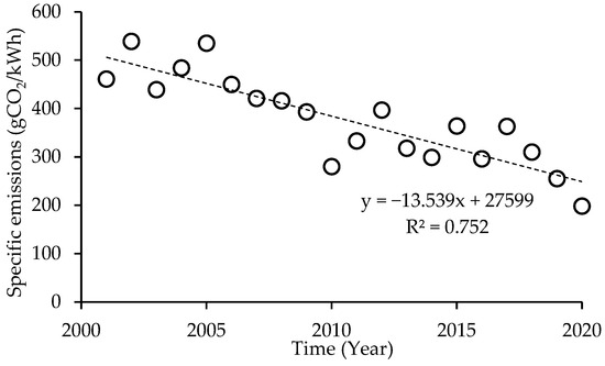 The specific CO2 emissions were obtained from the European Environment Agency (EEA) up to 2016 and the Portuguese Association of Renewable Energies (APREN—Associação de Energias Renováveis) from 2017 onwards, as shown in Figure 4. The results show a clear decreasing trend that is explained by the continuous installation of generation capability from renewable sources and the transition from coal to natural gas. In Portugal, the generation of electricity from coal ceased in January 2021. Data from 2021 are not available because they are now being reported only in terms of carbon equivalents and not just carbon, but the decreasing trend is maintained (129 g CO2 eq/kWh in 2021). Conservatively, the median specific carbon emissions from electricity generation in Portugal between 2016 and 2020 (254 g/kWh) were used in the simulations.
