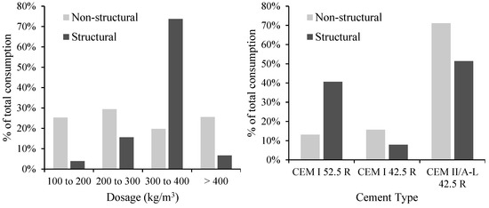 Consumption of cement per dosage (left) and per cement type (right) in non-structural and structural precast concrete.