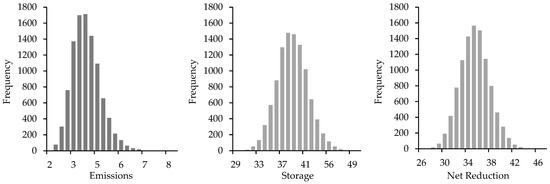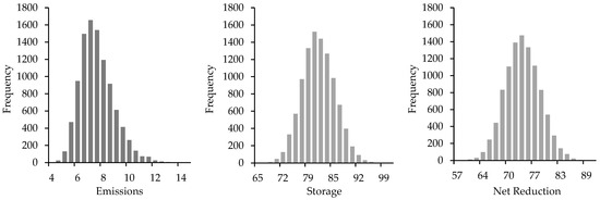 Considering the uncertainty of most of the parameters in the simulation, reflected, for instance, by a ratio of almost 10 between the maximum and minimum estimates for the specific emission for the CO2 supply, a stochastic analysis was carried out. The results of the 10,000 simulations are presented in Figure 7, Figure 8 and Figure 9 for carbon curing in three scenarios: only the non-structural precast elements, only the structural precast elements and the total precast industry.