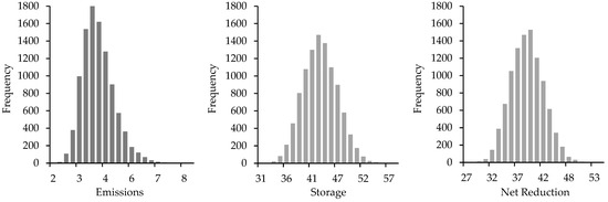 The consideration of these three scenarios is important, since there are plausible doubts regarding the durability of the reinforced concrete after being subjected to carbonation. In the scenario of carbonating both structural and non-structural elements (Figure 9), the emissions from the curing operation are between 4400 tonnes and 15,000 tonnes of CO2, while the carbon storage potential comprises between 65,000 and 98,700 tonnes of CO2. As such, the net reduction ranges between 57,500 and 90,400 tonnes of CO2, with a mode value of roughly 74,000 tonnes of CO2 that are prevented from being released into the atmosphere yearly. Considering that the most productive forest can sequester up to 11 tonnes of CO2 per hectare per year [70], this result indicates that the precast concrete industry in Portugal is able to sequester CO2 equivalent to 6696 hectares of forest per year.