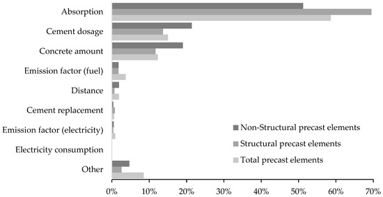 A sensitivity analysis was performed to assess the parameters that have the greatest influence on the variance of the results (Figure 10). As expected, the absorption rate, the cement dosage and the concrete amount are the most influential parameters, followed by the emissions from the transportation (distance x emission factor) of the CO2 between the capture point and the precast factories. The electricity consumption in all stages has a minimal impact, which in Portugal may be explained by the significant reduction in the emission factor with the ongoing transition to greener sources of energy.